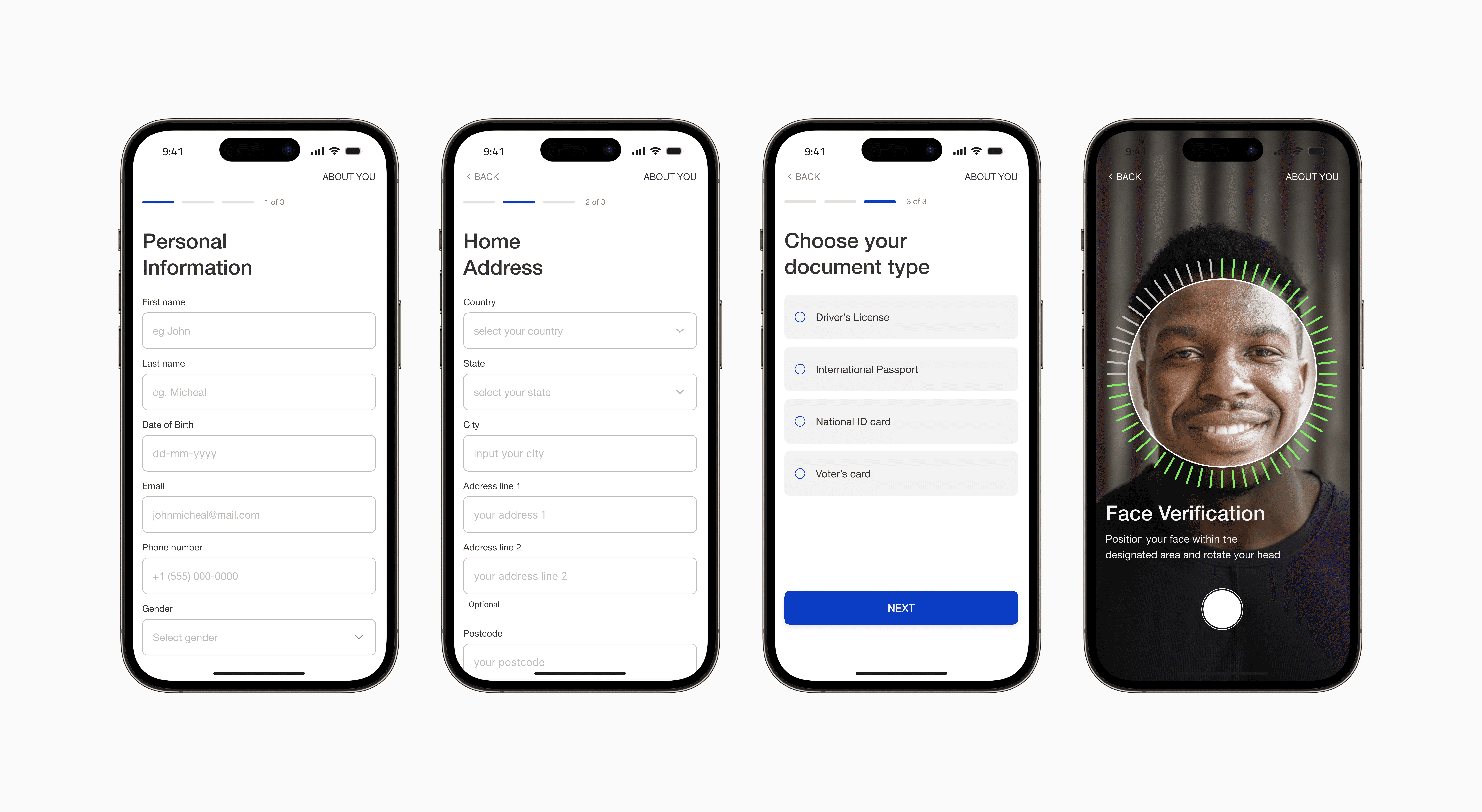 We designed screens to gather essential onboarding information from users, divided into three stages: personal information, address details, and document verification.