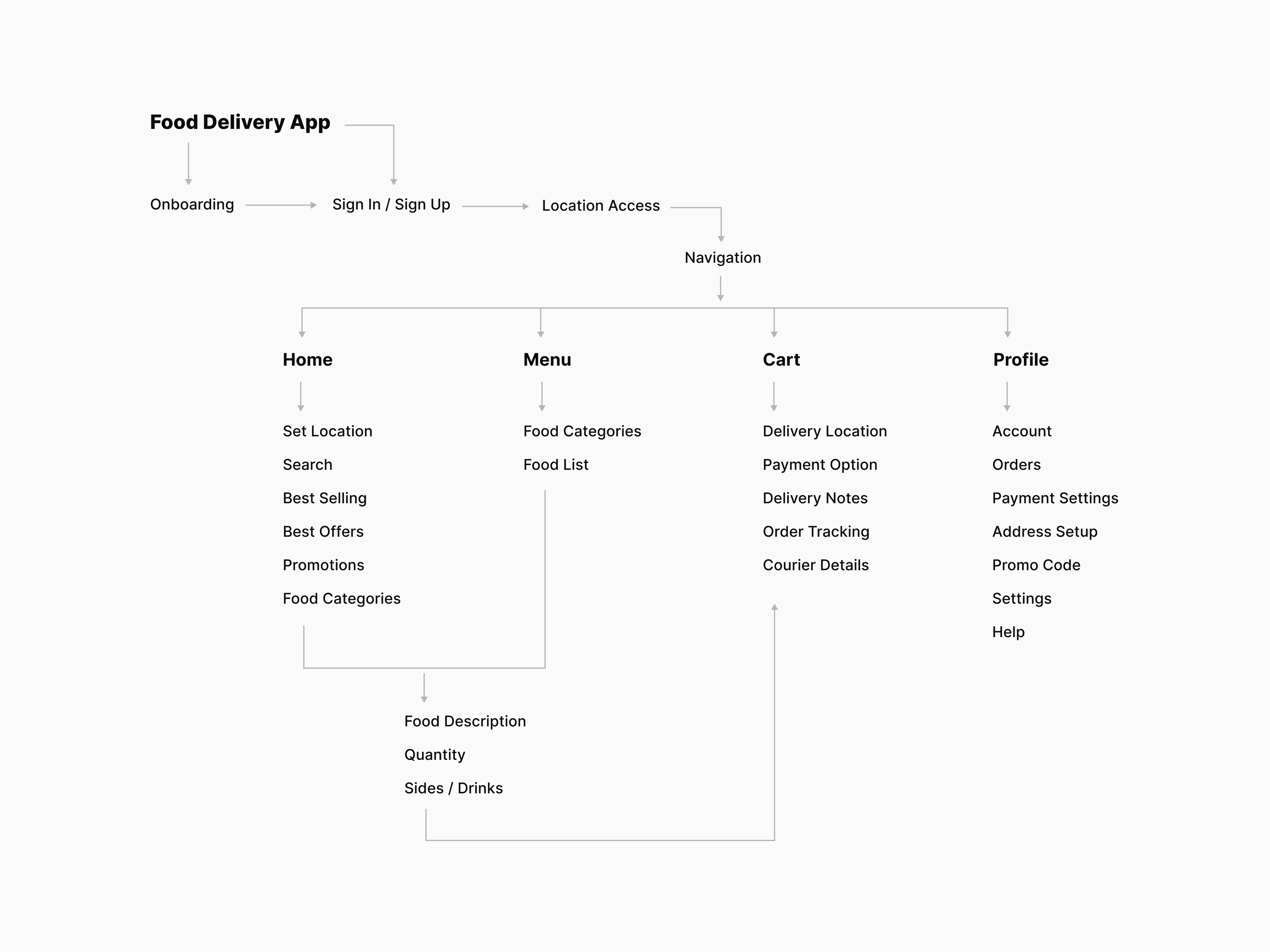 With clear problem areas in mind, I created detailed user flows to visualize every step a customer takes—from launching the app to completing an order. This helped streamline the navigation and eliminate unnecessary steps.